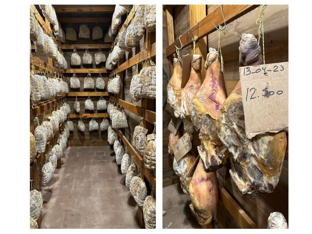 “Dice el Galpón porque nosotros nunca tuvimos una fábrica de salame, siempre tuvimos el galponcito donde mi papá hacía el salame”, cuenta orgullosa Claudia Visintín, heredera junto a su hermano de la receta del producto más famoso de Colonia Caroya: el salame. Ese galponcito fue remodelado y mejorado con mayor tecnología, como los equipos de frío que les permite tener producción durante todo el año. Cuenta que, en aquellas épocas, los salames sólo se hacían en invierno, estación en la cual carneaban los animales que habían criado.
