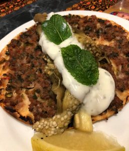 Para ir ganando tiempo pedimos un Lehmeyun (empanada armenia abierta) y una limonada. El tiempo de esa espera y el proceso de preparación a la vista da el inicio al relato de esta experiencia. Porque, como dice Caparrós (en el prólogo del libro Comer con los ojos) “(…) un plato es, primero, una idea: las buenas comidas se gustan desde mucho antes de sentarse a la mesa.”