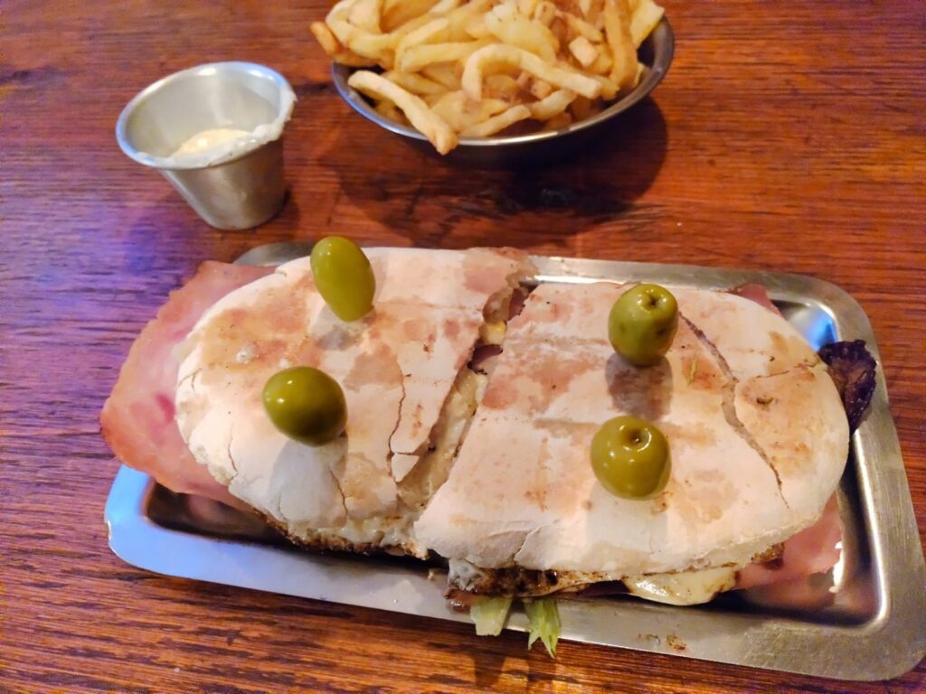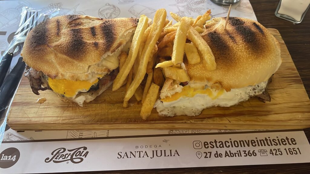Llegamos a Estación 27, resto clásico del centro, con su ambiente cálido y muchas mesas en varios espacios. Hay poca gente, nos sentamos no muy lejos de la ventana para poder observar el auto que estacionamos en la calle y no estamos muy seguros si está permitido. Pedimos una Stella de litro y vamos a la carta. Teban propone probar el lomo de la casa y yo afirmo sin dudarlo. Promediando la cerveza llega el lomo en tablita de madera, cortado al medio y con sus papas fritas, además una porción de mayonesa casera. En lo personal me gusta empezar por las papas, bien calientes. Éstas están muy bien y con la mayo alimonada mejor aún. Este lomo de la casa se anuncia con huevo frito, salsa golf, cebollas y panceta a la plancha, pero escasea de panceta y se nota. El pan está muy bien y el sabor también, aunque se siente el quemadito de la plancha. Nos pedimos otra cerveza y la tomamos en el patio, mientras hacemos tiempo para la próxima parada”.