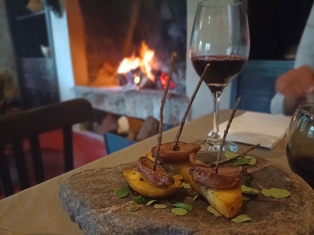 Pincho de paloma: Cuatro pinchos con base de papa y tope de pechuga, sobre una piedra alisada decorada con abundante orégano fresco (que se cuela en los bocados). El detalle: la ramita del bosque como pincho.