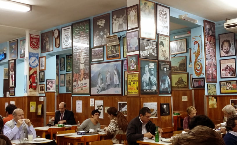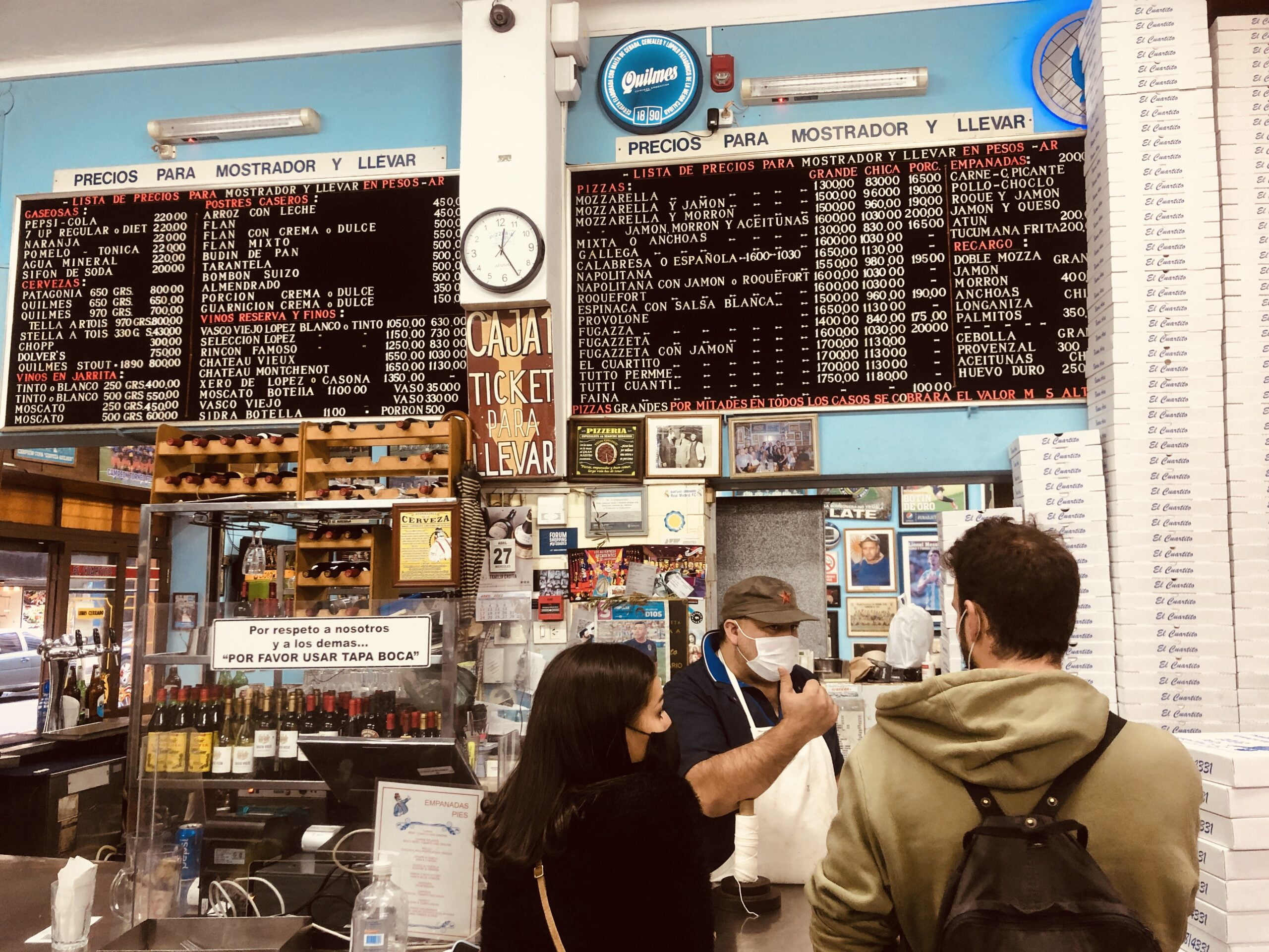 Llegamos a Imperio por recomendación de un local. Después nos enteramos que es una de las pizzerías más concurridas de la ciudad. Ubicada en Chacarita (frente al histórico cementerio) su horario de atención es muy amplio, la gente empieza a acercarse al mostrador a partir de las 6 de la mañana. Con 68 años de historia y alejada de los centros turísticos de Buenos Aires, esta pizzería sigue ganando adeptos por su idiosincrasia porteña. El mozo nos recomienda pedir la del “Imperio” que lleva jamón, morrones, palmito, huevo y tomate. No faltan los postres tradicionales de la pastelería porteña, como el flan con dulce de leche. Hacen mil pizzas por fin de semana y tienen más de 10 mozos trabajando. Su estética también es bien popular: el tango, el fútbol y los ídolos de la cultura argentina decoran sus paredes (Hay una estatua de Carlitos Balá en la puerta).