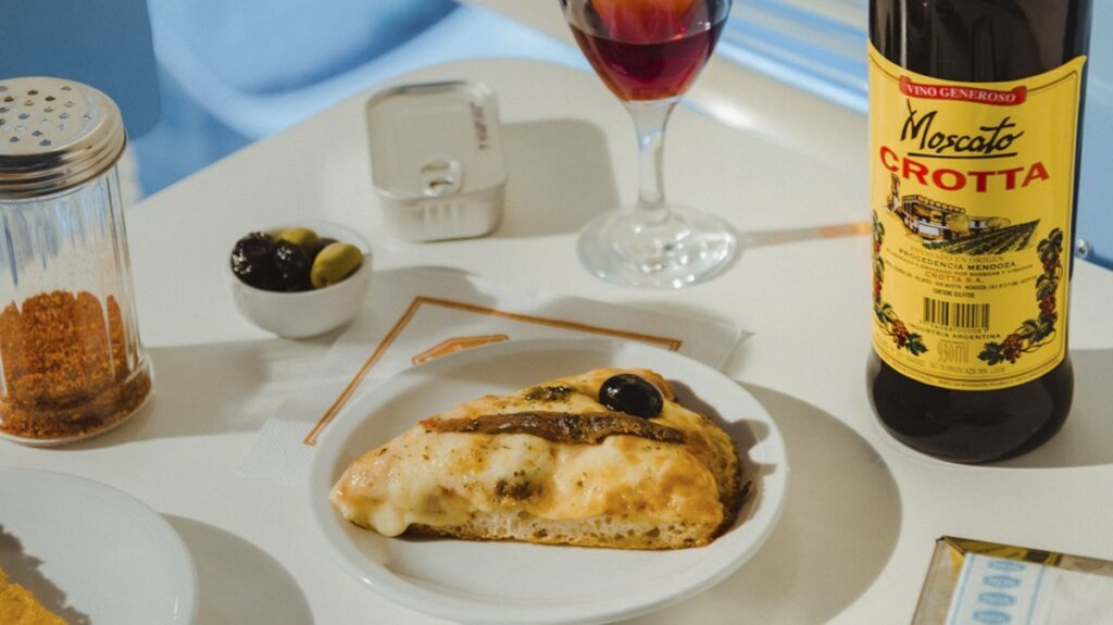 Por su parte, el moscato es un vino afrutado y dulce, de origen italiano, elaborado con uvas Moscatel. A principios del siglo XX, el inmigrante José Eduardo Crotta fundó su bodega en Mendoza y aprovechó la expansión de las pizzerías en los años 30 para vender este vino por copa haciéndolo popular en nuestro país.