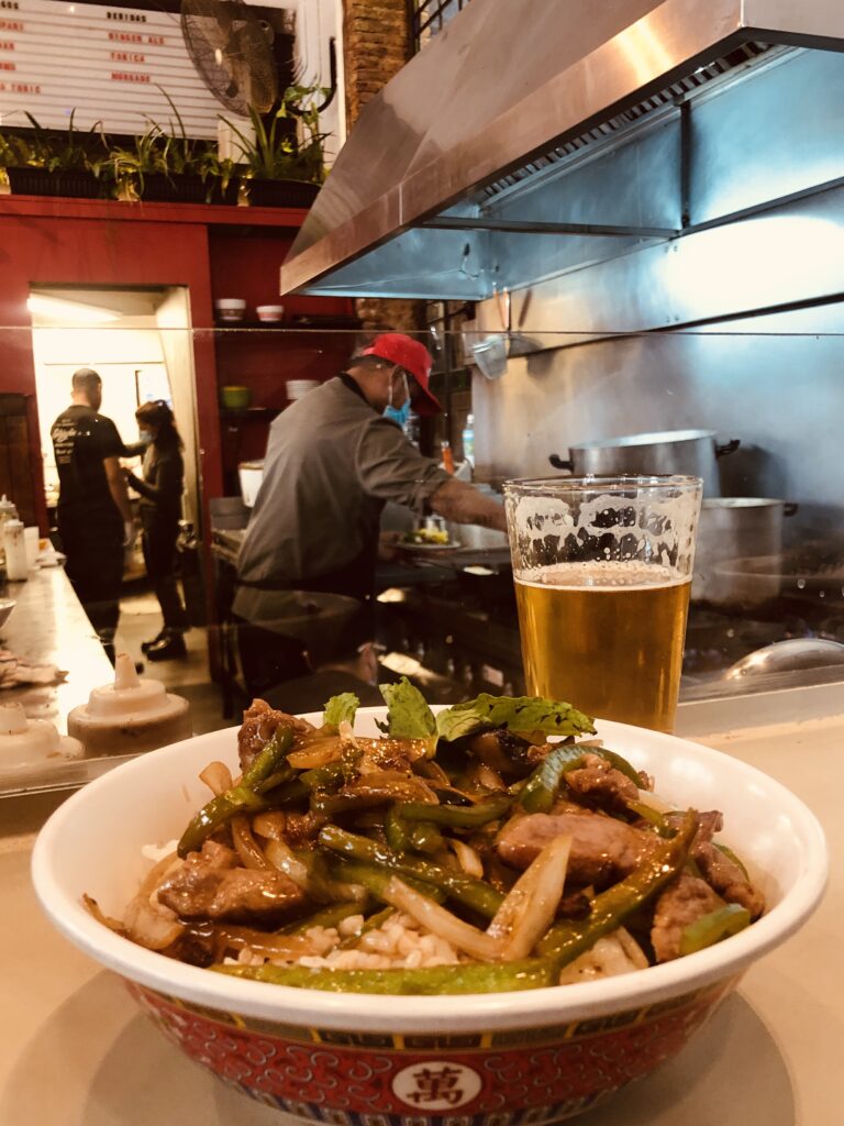 Acomodados rápidamente en la barra tuvimos acceso directo al espectáculo de la cocina a la vista: los fuegos como protagonistas y los cocineros bailaban un ritmo frenético pero metódico y ordenado alrededor de ellos. Hacían saltar woks, se lucían manejando los palitos largos con los que revuelven sus mezclas, los caldos humeaban aromas exquisitos, todo se volcaba sobre cazuelas de plástico modestas, con inscripciones chinas o taiwanesas.