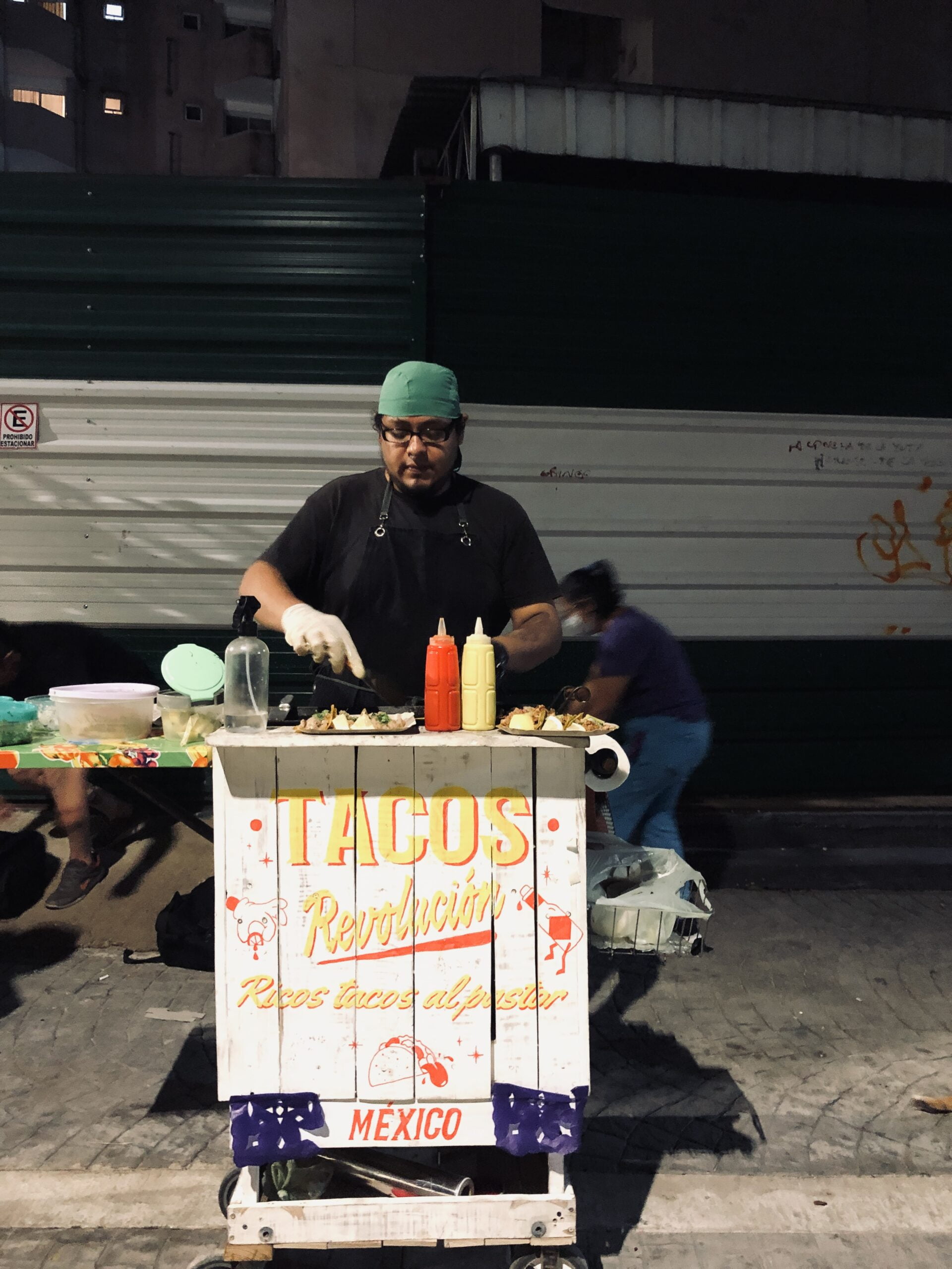 El carrito de Tacos Revolución es pequeño, rústico, está fabricado a mano, apenas reforzado con tornillos. Sin embargo, soporta una plancheta donde cocinan las carnes y calientan las tortillas, tiene una extensión que funciona de mesa para armar los tacos, con los condimentos extra y, por supuesto, sus salsas picantes. “El rojo pica más, el verde pica menos, pero también tiene chile. Es como los señalamientos, el rojo significa peligro”.
