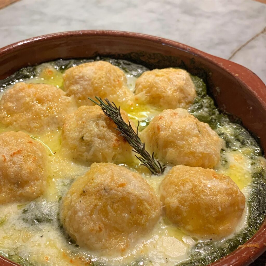 Las papas a la crema es la guarnición que recomiendo probar. El sabor ahumado que le da el horno de leña, el crocante, la crema y mozzarella derretida. Simple y delicioso.