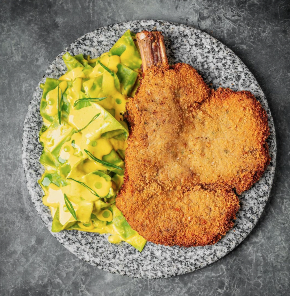 T-Bone de ternera con papas, champiñones, provenzal, cebolla grillada y manteca especiada.