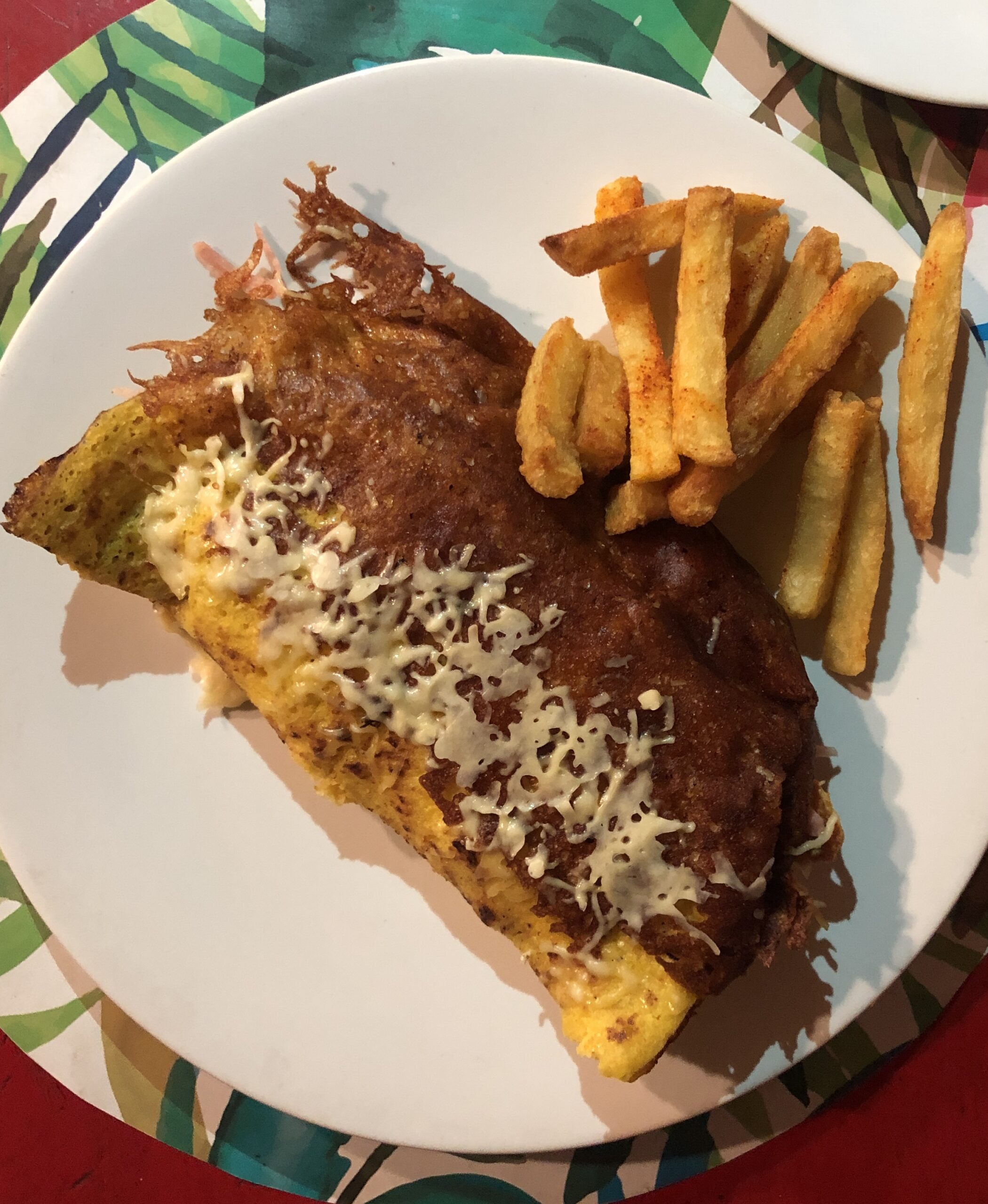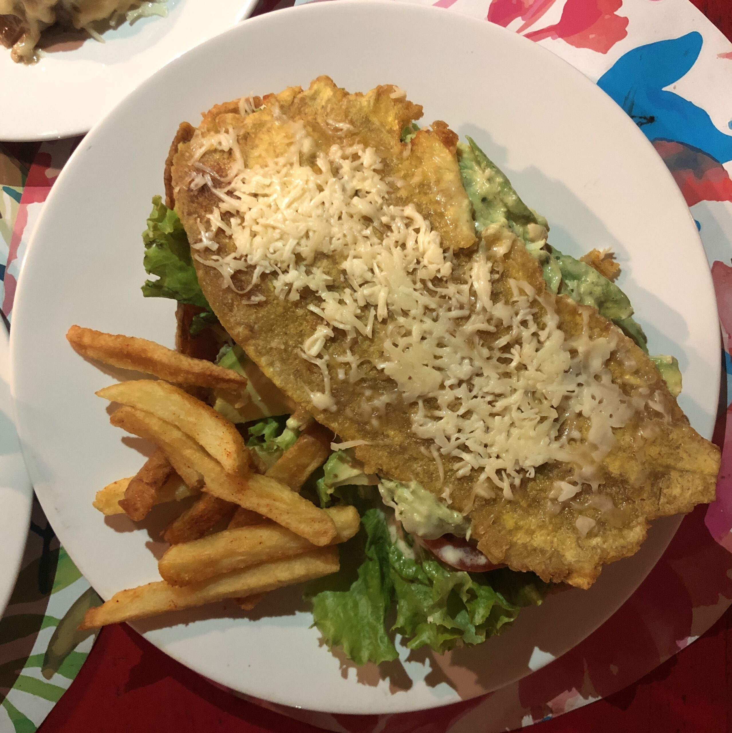Patacones, hechos con plátanos verdes fritos. Es acompañamiento y puede llevar carne mechada, pollo, queso.